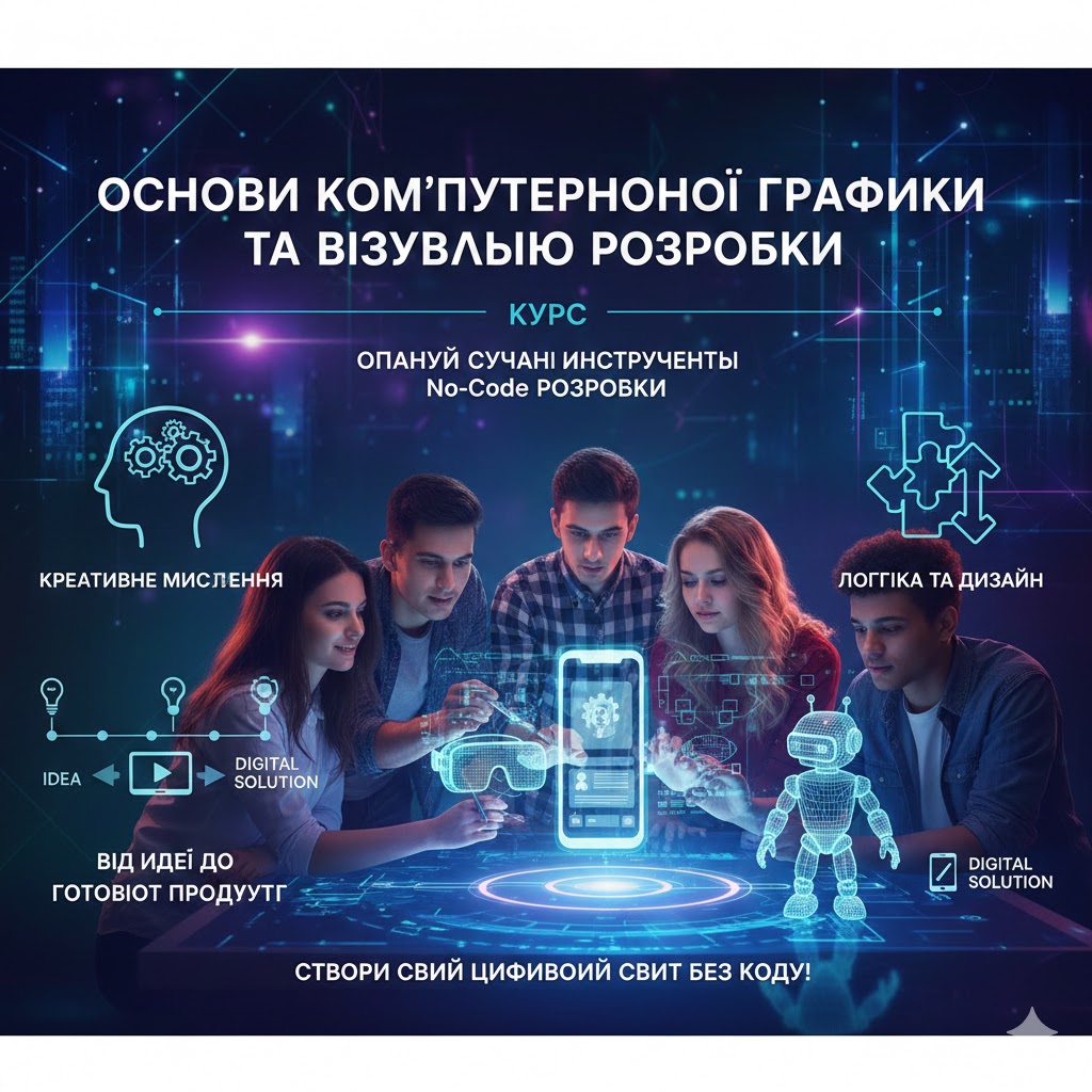 Курс спрямований на опанування сучасних інструментів створення цифрових продуктів без використання мов програмування (No-Code технології). Програма поєднує розвиток креативного мислення, основ дизайну та логіки побудови інтерактивних систем. Студенти навчаться проходити повний шлях від виникнення ідеї до створення функціонального цифрового рішення.